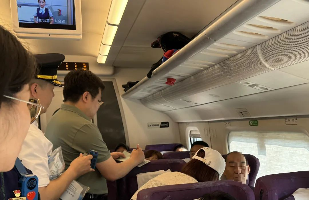 6月23日下午4時(shí)左右,從武漢天河機(jī)場(chǎng)開往襄陽東站的D5223次列車途經(jīng)棗陽站時(shí),一名男性乘客突然暈厥。“1號(hào)車廂有位乘客突發(fā)疾病,需要醫(yī)務(wù)人員前往救治!”廣播里傳來的緊急呼叫聲打破了車廂內(nèi)的寧靜。此時(shí),通用技術(shù)通用醫(yī)療所屬三六四醫(yī)院護(hù)士周君、萬雪、周祝惠坐在6號(hào)車廂,護(hù)理部主任喻英、護(hù)士長魯聰穎、護(hù)士楊陽坐在8號(hào)車廂。聽到廣播尋醫(yī)的瞬間,她們立即默契起身,直奔1號(hào)車廂。她們趕到1號(hào)車廂時(shí),只見1名男性乘客大汗淋漓、面色蒼白、皮膚濕冷。護(hù)士們與列車長迅速將男子扶至座位,對(duì)其進(jìn)行查體并測(cè)量呼吸、脈搏;詢問男子情況后,初步判斷為低血糖。護(hù)士們立即為該乘客進(jìn)行對(duì)癥處理,隨后又為他提供了糖果、面包等緩解低血糖癥狀的食物。稍作休息后,該男子臉色明顯轉(zhuǎn)為紅潤,冷汗也逐漸消退。護(hù)士和列車長叮囑他下車后及時(shí)到醫(yī)院就診。